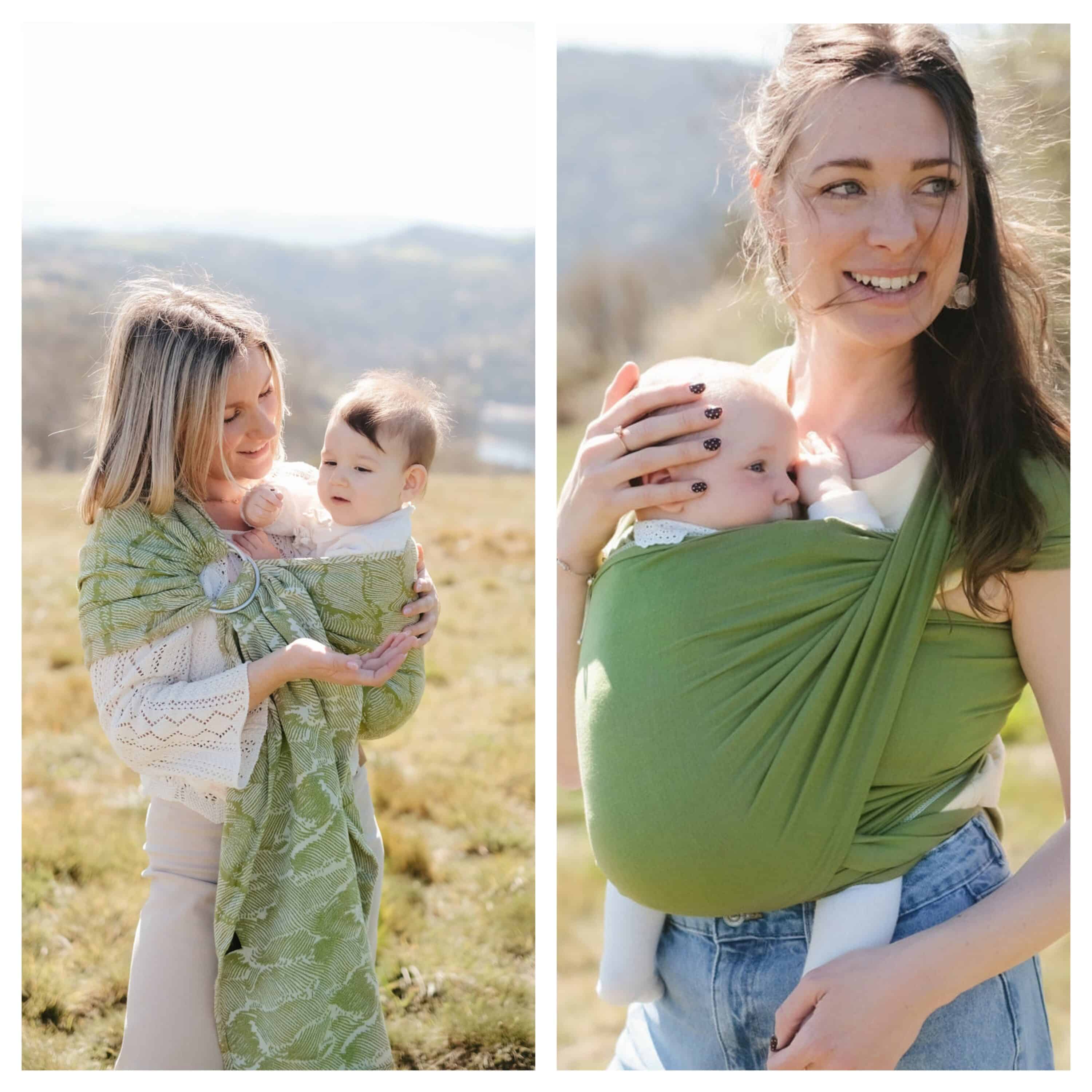 Le sling est parfait pour un câlin rapide, l’écharpe quand à elle te servira pour de longues ballades.